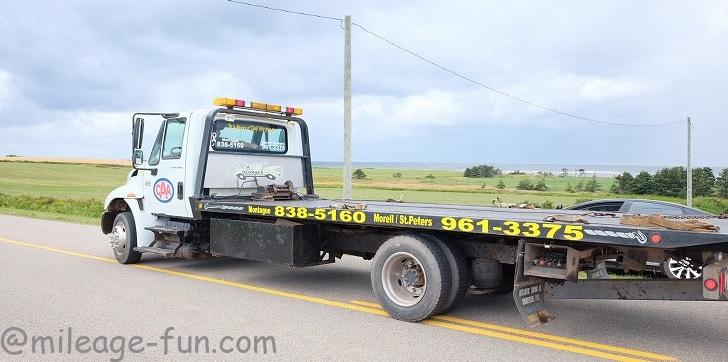 レッカー車です。レッカー車が来るまで結構恐怖でした。「無事に帰れるだろうか?」「レンタカー本当に来てもらえるのか?」「高額の牽引代請求されたらどうしよう?」「飛行機は翌日に乗るので助かった~。」などいろいろと考えが頭の中をグルグルまわりました。
