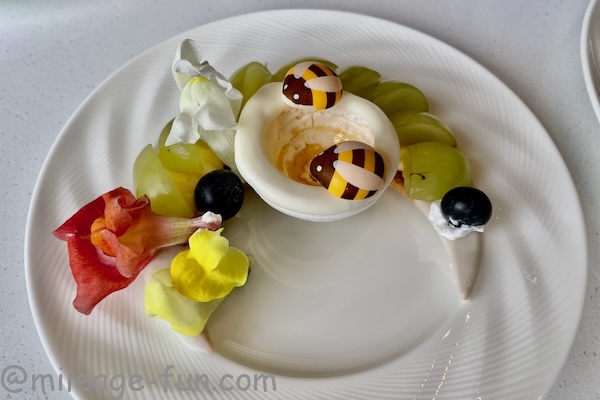 ホテルの方が、最後にはちみつを追加してくれて完成です。宮古島産はちみつです。はちみつは蜂が2匹いる白いお菓子のケースに満たしてくれます。