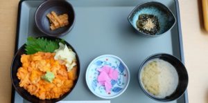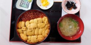 筆者が注文したのはうに・いくら丼です。この日は松前町塩水うにを使っていました。ムラサキウニです。