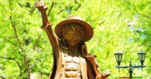 路面電車で市立体育館前まで移動し、モンキー・D・ルフィー像を見に行きました。熊本駅からだと16駅で34分かかります。それから歩いて800m、県庁前のルフィー像に到着です。