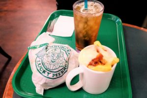 「ダントツ人気No.1セット」という名前のセット(チャイニーズチキンバーガー&ラキポテ&自家製ウーロン茶)を注文。ラピポテというマグカップに入ったポテトも衝撃的でした。ミートソースとチーズがかかってます。<1セット702円>