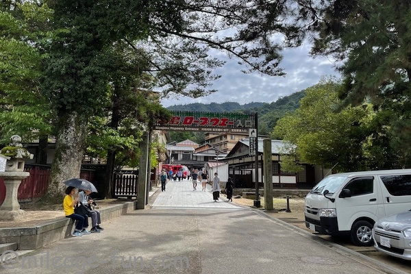 厳島神社の鳥居から北の方に10分ぐらい歩くとロープウエーの入り口に到着。こちらに商店街があり、ロープウエーのチケットも売っています。乗り場である紅葉谷駅でも売っています。