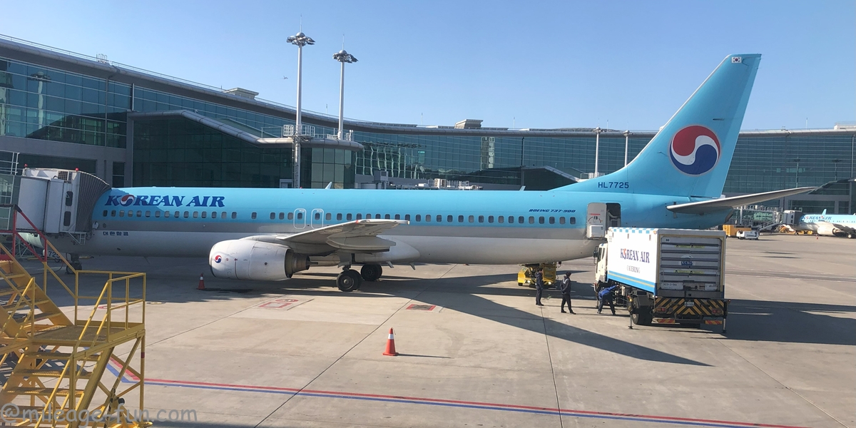 大韓航空の機体に乗り込みます。筆者の人生2度目の大韓航空です。水色の機体が良いですね。