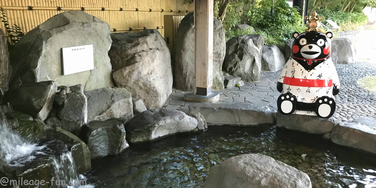 さくら湯と道路を挟んで向かい側の公園に「山鹿灯籠足湯くまモン(勝手に名前を付けました)」を発見しました。
